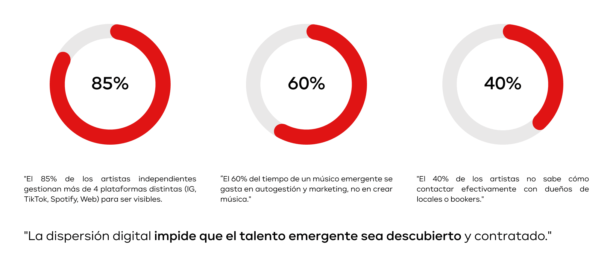 5 de cada 6 artistas entrevistados afirmaron sentirse frustrados por tener su contenido repartido en distintas plataformas (Spotify, YouTube, Instagram, etc.), sin un lugar donde consolidar su imagen profesional.