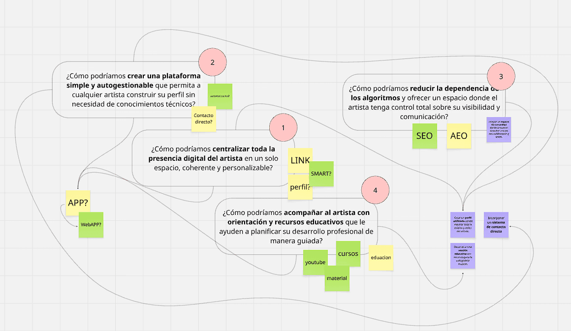 A partir de los temas e insights obtenidos, se generaron múltiples ideas relacionadas con la visibilidad, gestión y profesionalización del artista.