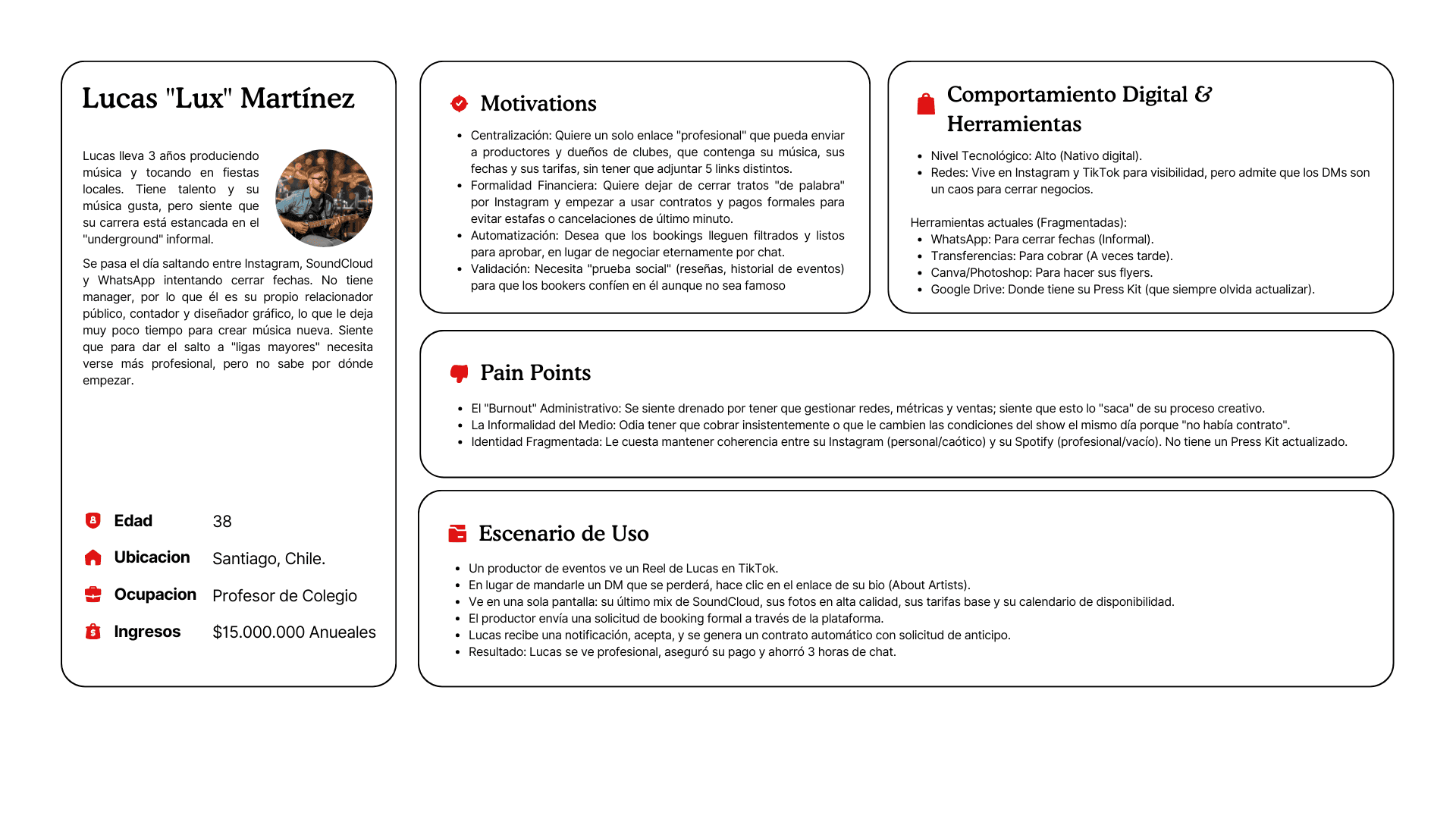 Mi mejor amigo es un artista emergente, y a lo largo de su proceso creativo me di cuenta de las enormes barreras que enfrentan músicos independientes para mostrarse profesionalmente. Veía cómo invertía tiempo en ensayar, grabar y producir, pero luego debía gestionar redes, responder mensajes, coordinar tocatas y buscar contratos, todo de manera informal, sin una herramienta que centralizara su trabajo.