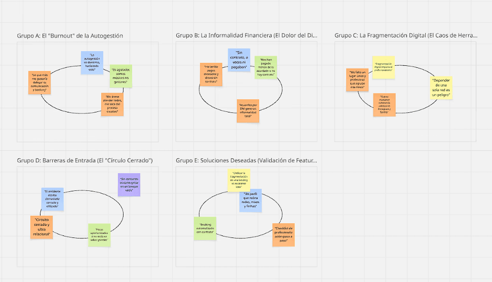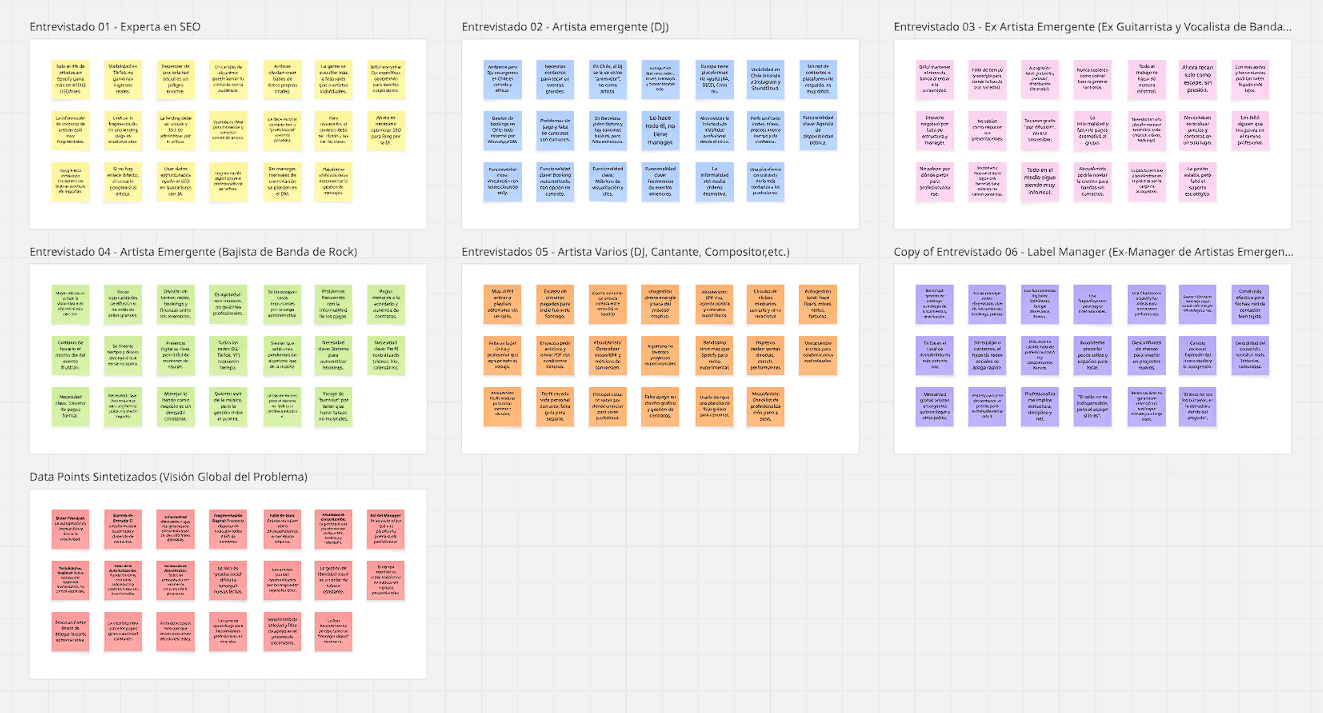 Cada data point representa una pieza de información cualitativa —por ejemplo, una necesidad, frustración o expectativa— que luego fue agrupada mediante un mapa de afinidad en categorías temáticas como gestión artística, visibilidad digital, autonomía creativa y profesionalización.