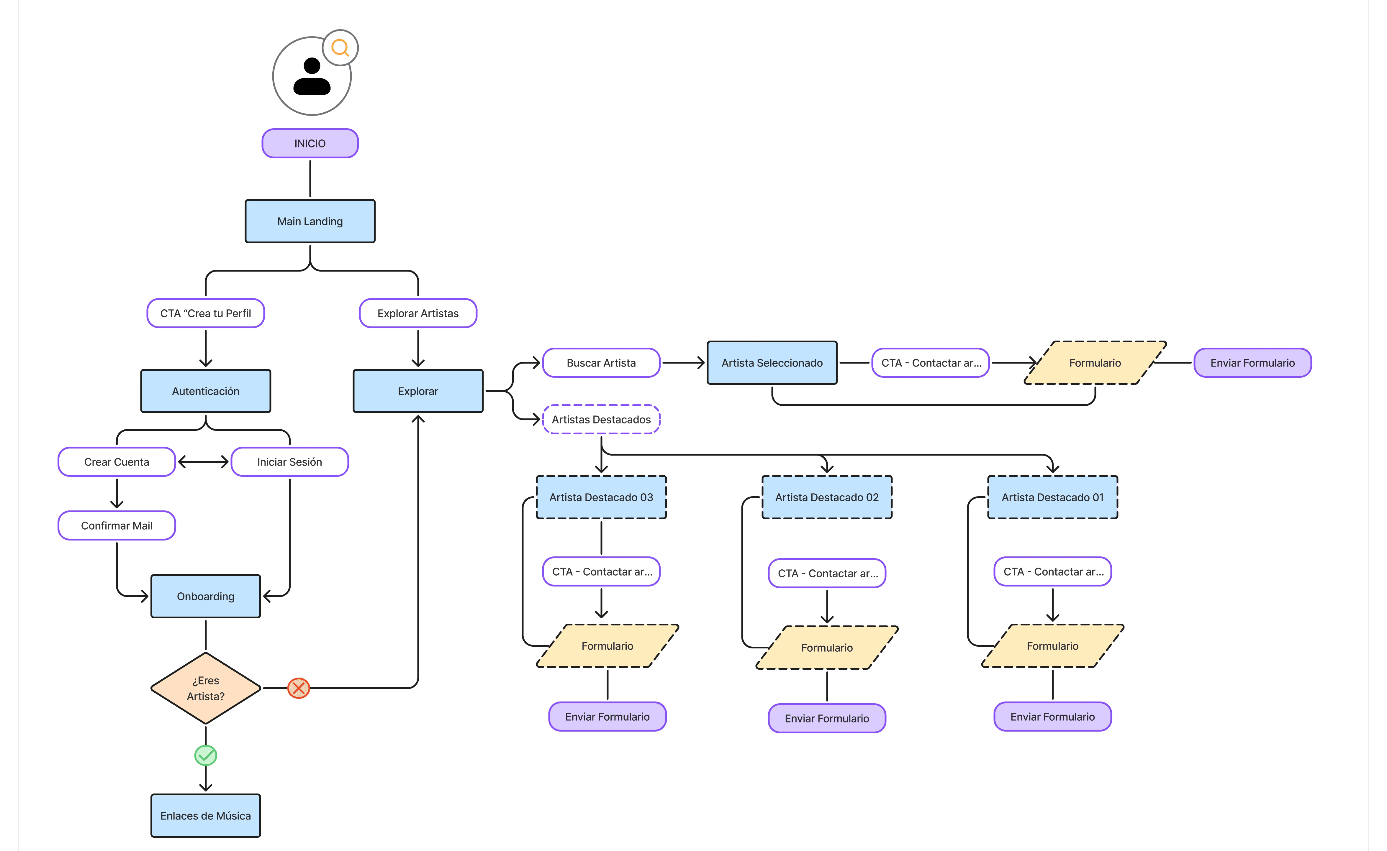 Estos flujos representan las rutas críticas que un artista seguiría al interactuar con la plataforma.