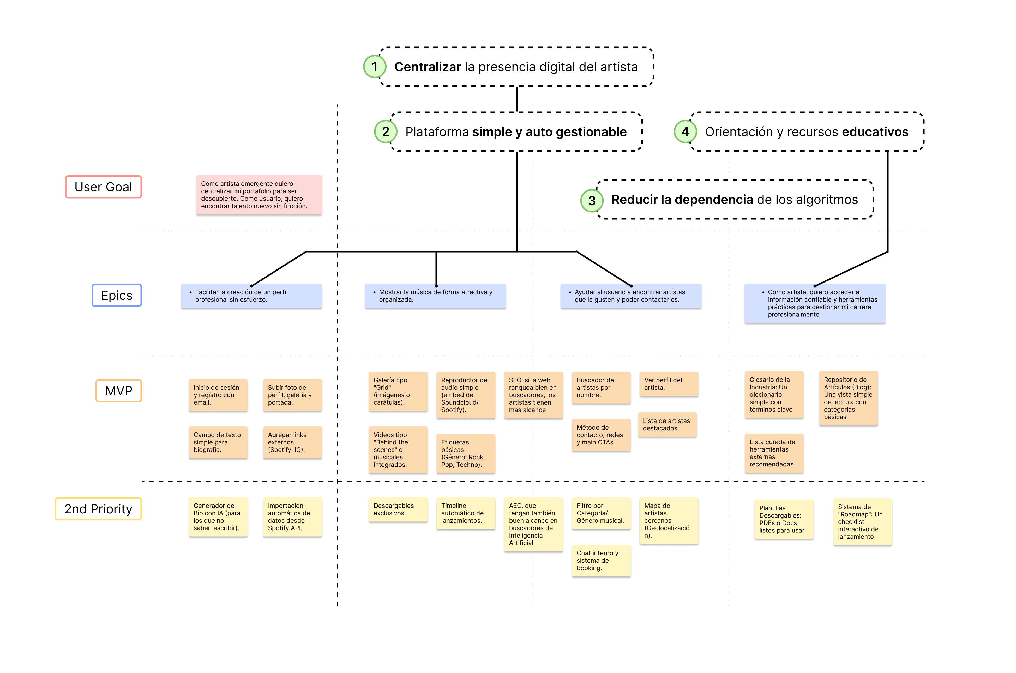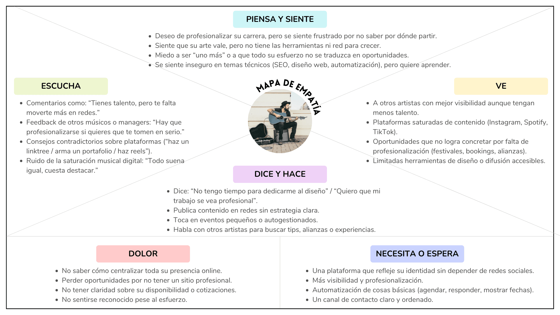 Estos testimonios confirmaron la necesidad de diseñar una solución simple, visual y profesional, capaz de reunir en un solo espacio todo lo que define a un artista: su sonido, su historia y su identidad.