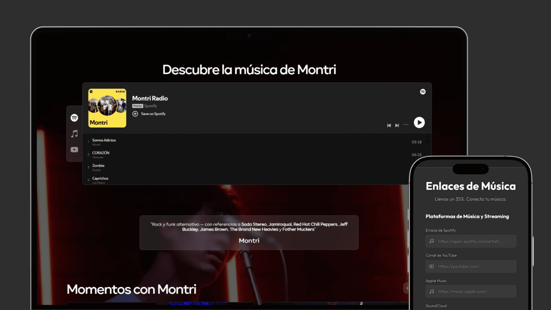Integra Spotify, Apple Music, YouTube y SoundCloud en una página unificada para que tus fans escuchen donde prefieran.